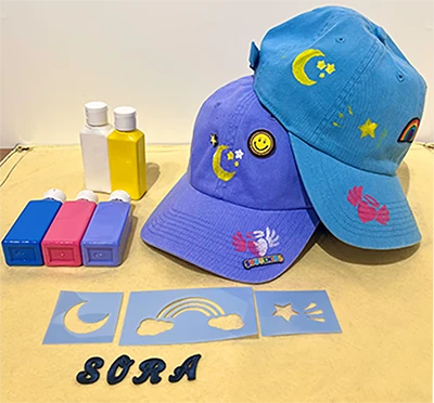 7色のキッズキャップからお好きな色を1つ選んで、布用絵の具やペンで“空”を自由に表現。自分だけのカスタマイズキャップが作れます。