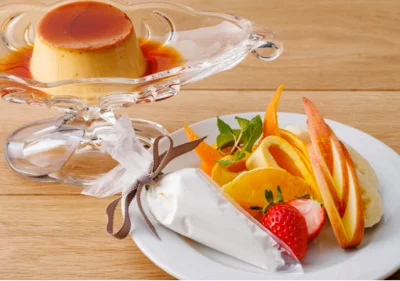 プリンアラモードの盛り付けにチャレンジできる人気メニュー。期間中はパティシエ気分の笑顔を残せる、記念写真のサービス付き!ご予約不要で、店内ご利用時にお席からオーダーいただけます。