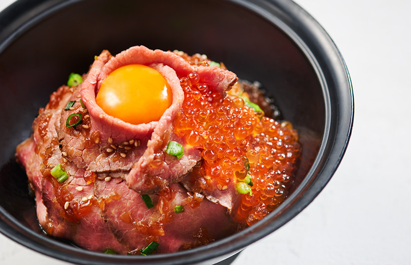 大人気のローストビーフ丼にイクラをのせて、玉ねぎベースの甘辛いソースで仕上げた贅沢な一品。お肉の旨みといくらの食感が絶妙にマッチしたおいしさです。みそ汁、ポテトサラダ、漬物付き。