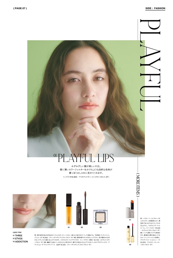(PAGE.07)SIDE:FASHIONPLAYFUL010201.イエローベースにオレンジを入れたカラーは肌馴染みよく、個性的でありながらもナチュラルな仕上がりに。ミネラルシアーマットルージュハニーイエロー¥3,520/エトヴォス〔タウンフロント1F〕02.リッチな艶とクリアな発色を叶え、魅惑的な唇を演出してくれるルージュ。トリートメント効果も。ブリリアントルージュビジュー11¥3,850/アルビオンドレッサー〔タウンフロント1F〕(MOREITEMS)01PlayfulLipsみずみずしい艶が美しい口元。唇に薄いカラーフィルターをかけたような自然な色味が春っぽくおしゃれに見せてくれます。トップス¥19,800/マイカアンドディール〔タウンフロント2F〕010203USEDITEM01THREE02ETVOS03ADDICTION01.唇の自然な赤みを引き出すイノセントなヌーディーイエロー。滑らかに伸びるので、リップと重ねても。THREEディヴァインリップジェム01¥3,850/フルーツギャザリング〔タウンフロント1F〕02.表情を軽やかにするオレンジブラウン。肌や髪色からも浮かないナチュラルな眉に仕上げてくれます。ミネラルカラーリングアイブロウティーブラウン(限定)¥2,750/エトヴォス〔タウンフロント1F〕03.繊細で上品なパールがまぶたに伸び広がり、艶やかな目元に仕上げてくれるパールタイプのアイシャドウ。アディクションザアイシャドウパール032P¥2,200/フルーツギャザリング〔タウンフロント1F〕
